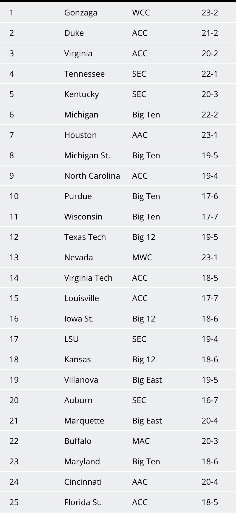 VCU and Temple remain right in the race, Arizona had a weird week where they split at home to the Washington schools, with the loss being by 20 to Wazzu. Conclusion: Pac 12 still a one bid league until further notice. Also for what it’s worth, Wofford and Lipscomb may both be in at-large consideration in the event they don’t win their conferences.