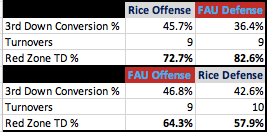 These types of situations scream for me to take FAU, which usually I would. Rice is the better team on paperHowever, my process in terms of important stats I consider shows one glaring advantage for Rice that could shift the game flow in their favor. Both teams are comparable on third down (both offense and defense) and balancing turnovers, however, Rice’s offense has been really good in the red zone, while FAU’s defense has been very bad in the red zone.